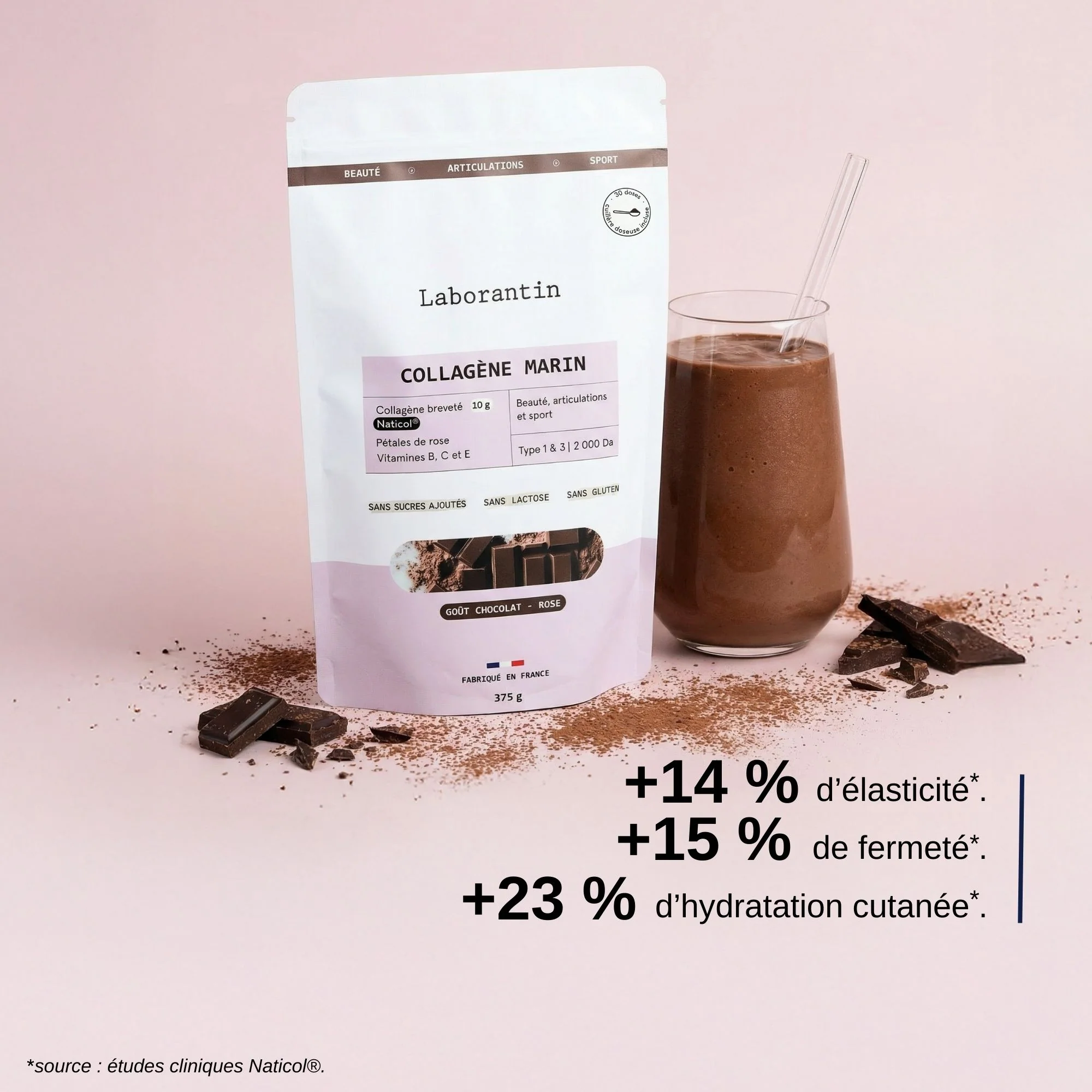Sa formule gourmande au cacao bio et sans sucres ajoutés, enrichie en peptides de collagène marin breveté Naticol®, vitamines B, C et E hautement dosées et en pétales de roses, agit efficacement contre les signes du vieillissement tout en améliorant la beauté des cheveux et des ongles et en renforçant la santé des articulations.