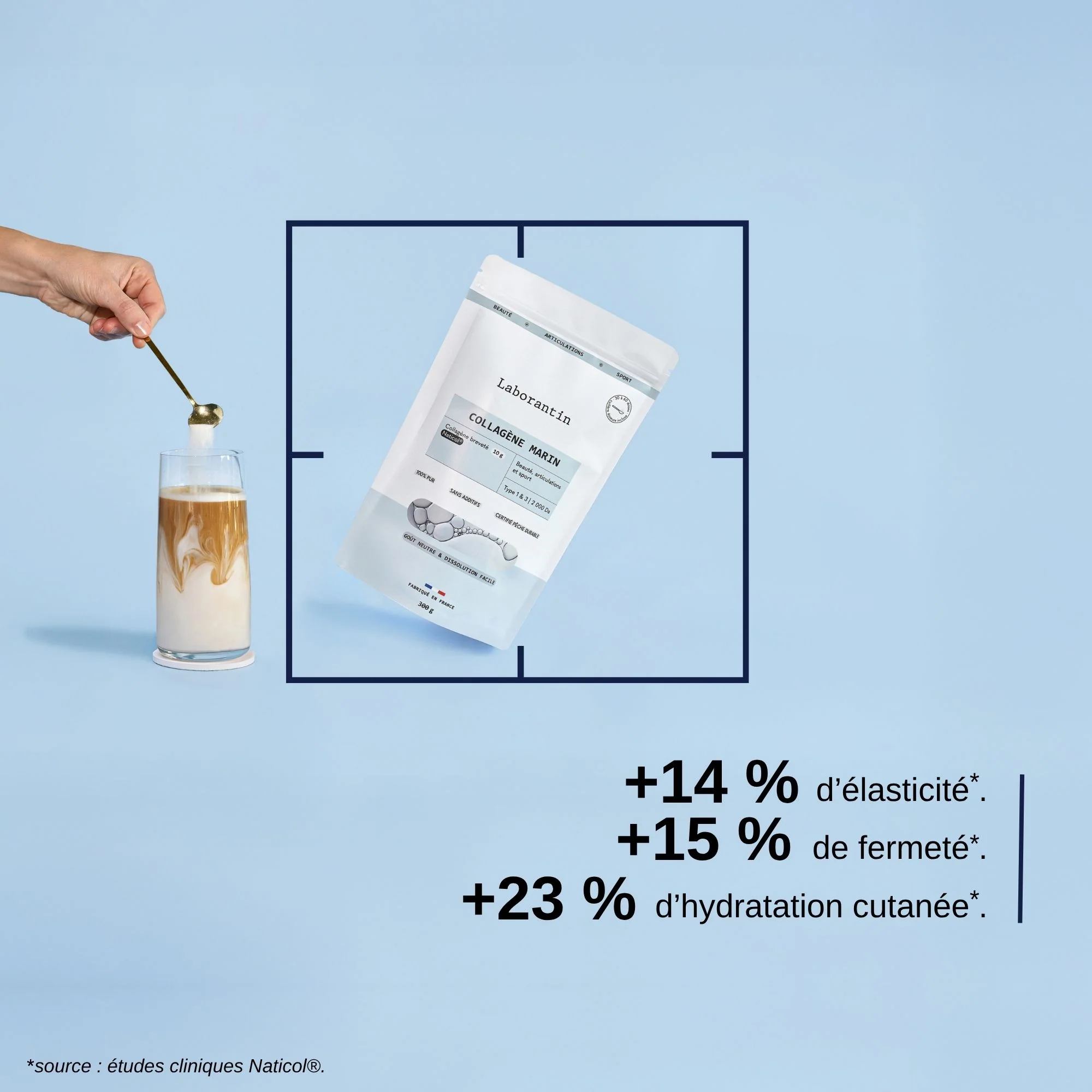 Sa formule sans sucres ajoutés et sans goût ni odeur, au poids moléculaire optimal (2 000 Da) et aux 7 études cliniques garantit une assimilation élevée et une efficacité maximale pour améliorer la fermeté de la peau, l'élasticité cutanée et soutenir le confort articulaire.
