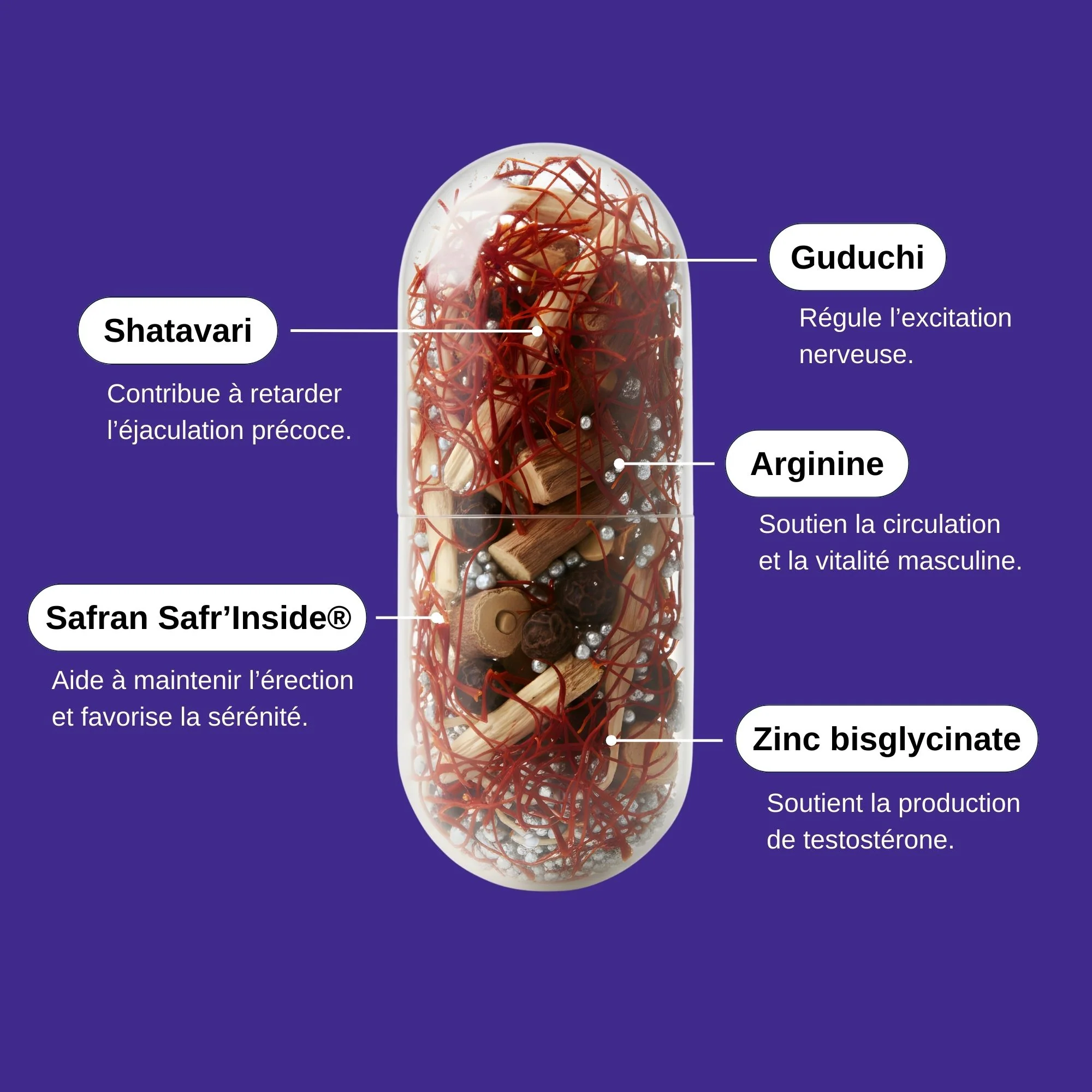 Ce complément alimentaire soutient naturellement la fonction sexuelle et les performances. Sa formule experte associe des actifs reconnus et brevetés, tels que le Safr’Inside™, le Guduchi ou encore le Shatavari, et aide les hommes à tenir plus longtemps sans impacter leur désir.