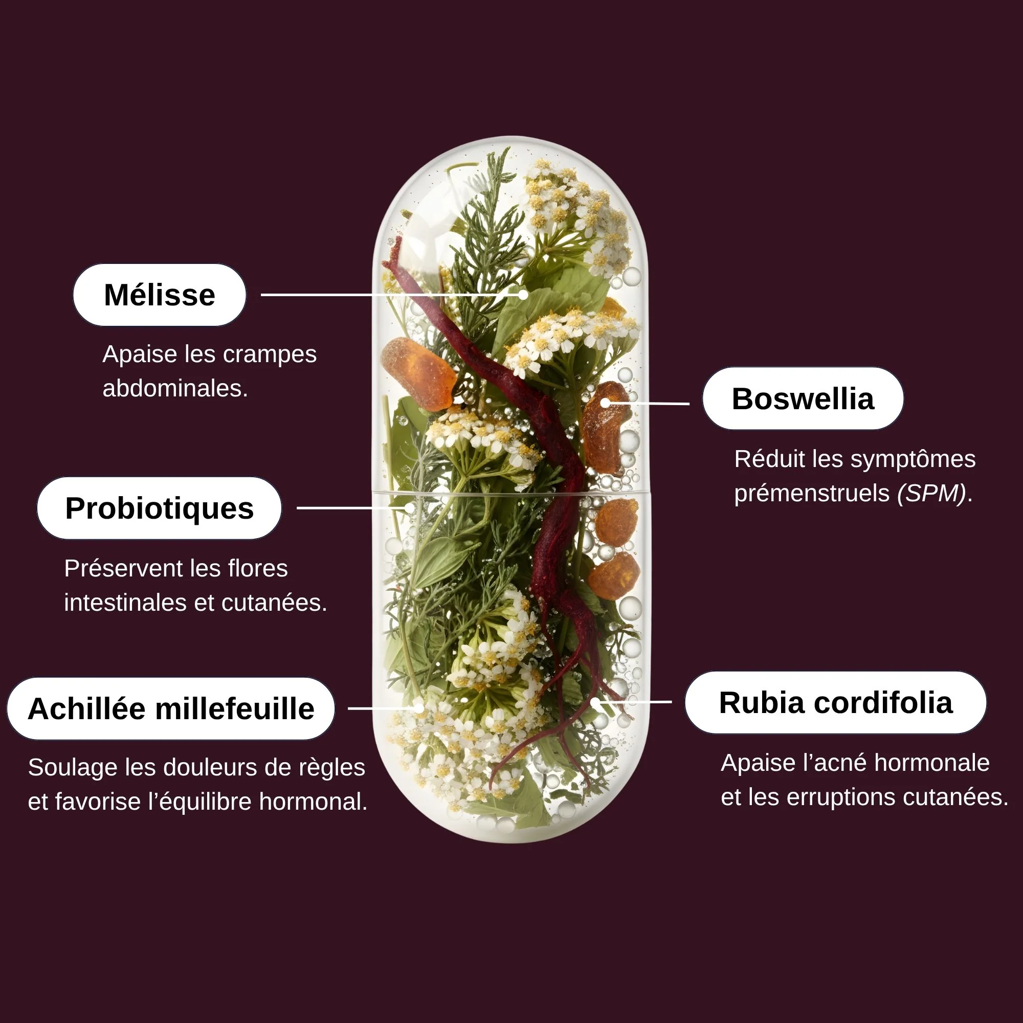 Avec une formule unique à base de probiotiques et de plantes, Probio Menstruations réduit les douleurs liées aux règles et aide à lutter contre l’acné hormonale avant et durant le cycle.
