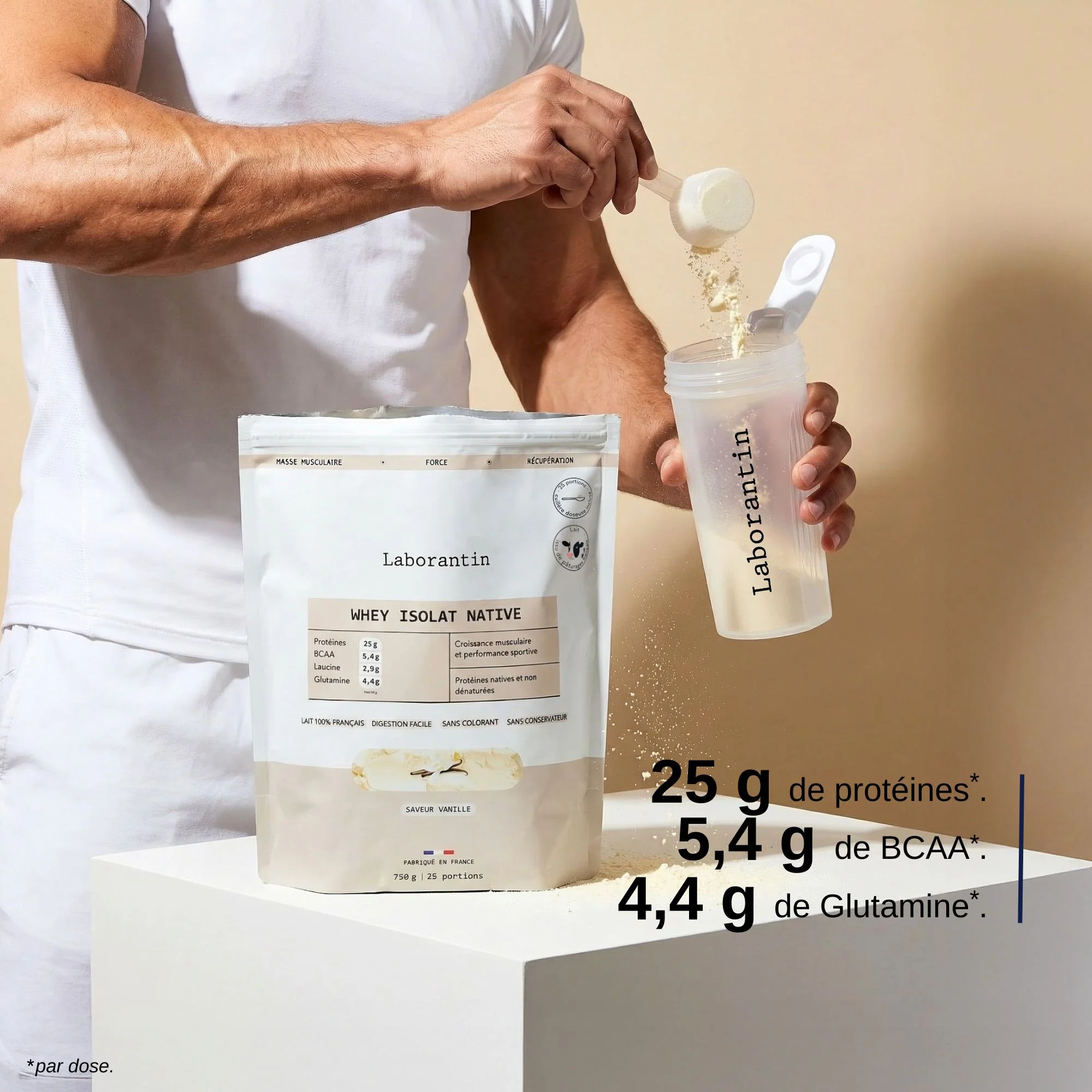 Issue de lait français et dosée à 98% de protéines, notre Whey Isolat Native allie pureté maximale, performance sportive et goût vanille intense.